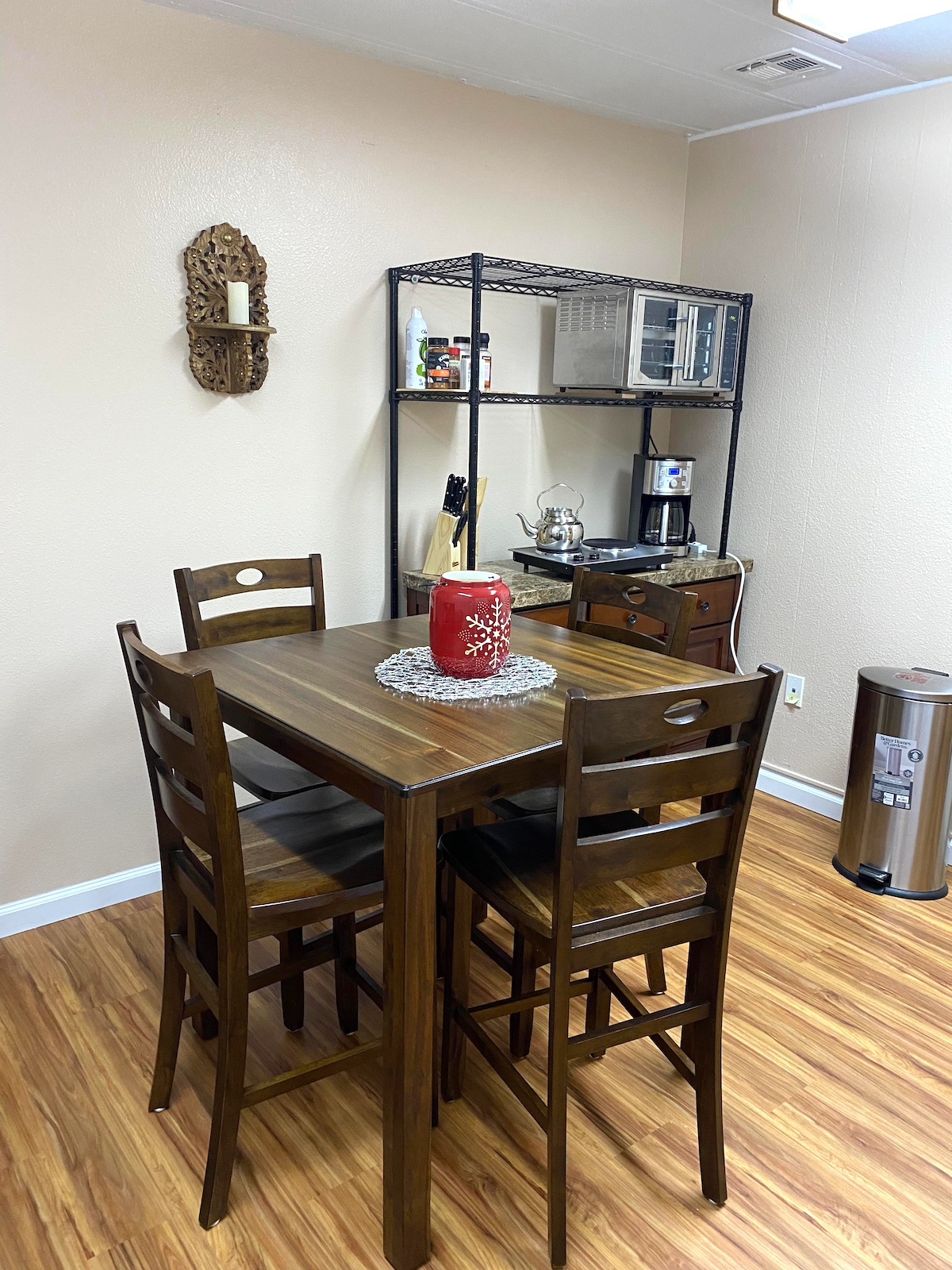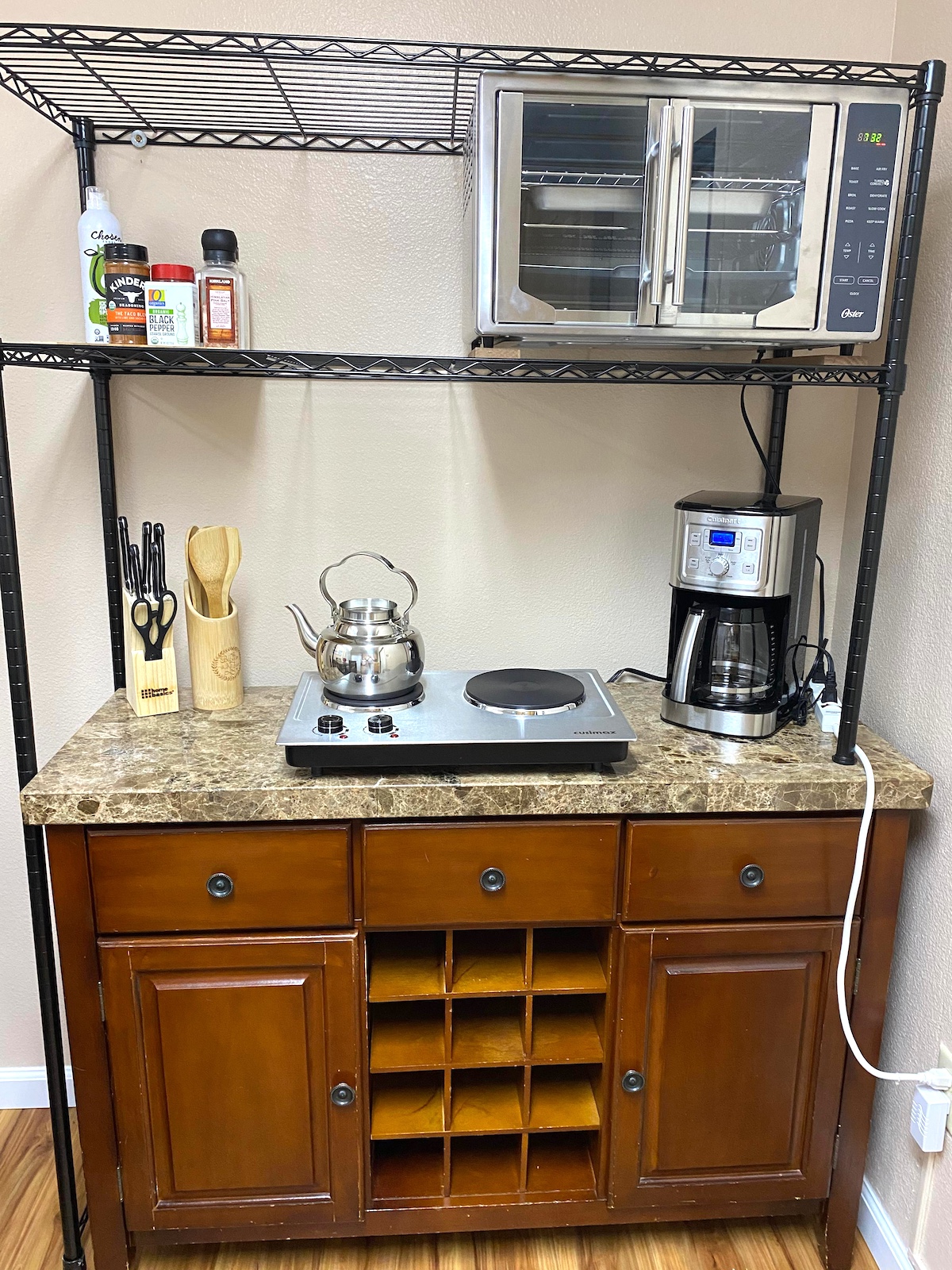 Jest kuchenka elektryczna oraz mały piecyk do pieczenia, mikrofalówka do odgrzewania jedzenia. również jest pralka i suszarka z płynem do prania, czysta, pachnąca pościel, ręczniki, produkty kosmetyczne do kąpieli.